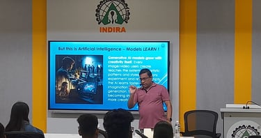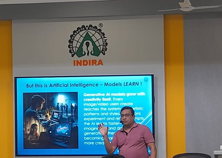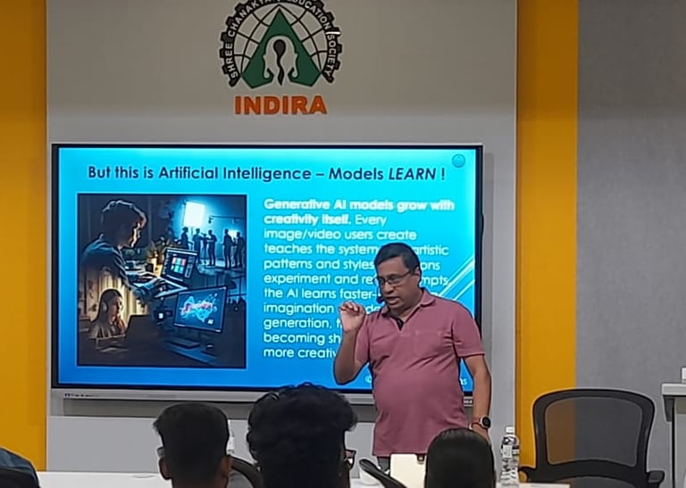 I spent a wonderful afternoon at the School of Liberal Arts, Indira University, Pune, on 17th November taking students into the world of AI Filmmaking and sharing the vision behind the School of AI Films (SAIF). Around 60–70 curious and energetic students—along with their faculty—joined in as we dived into how storytelling and cinema are being transformed by the new wave of AI tools.